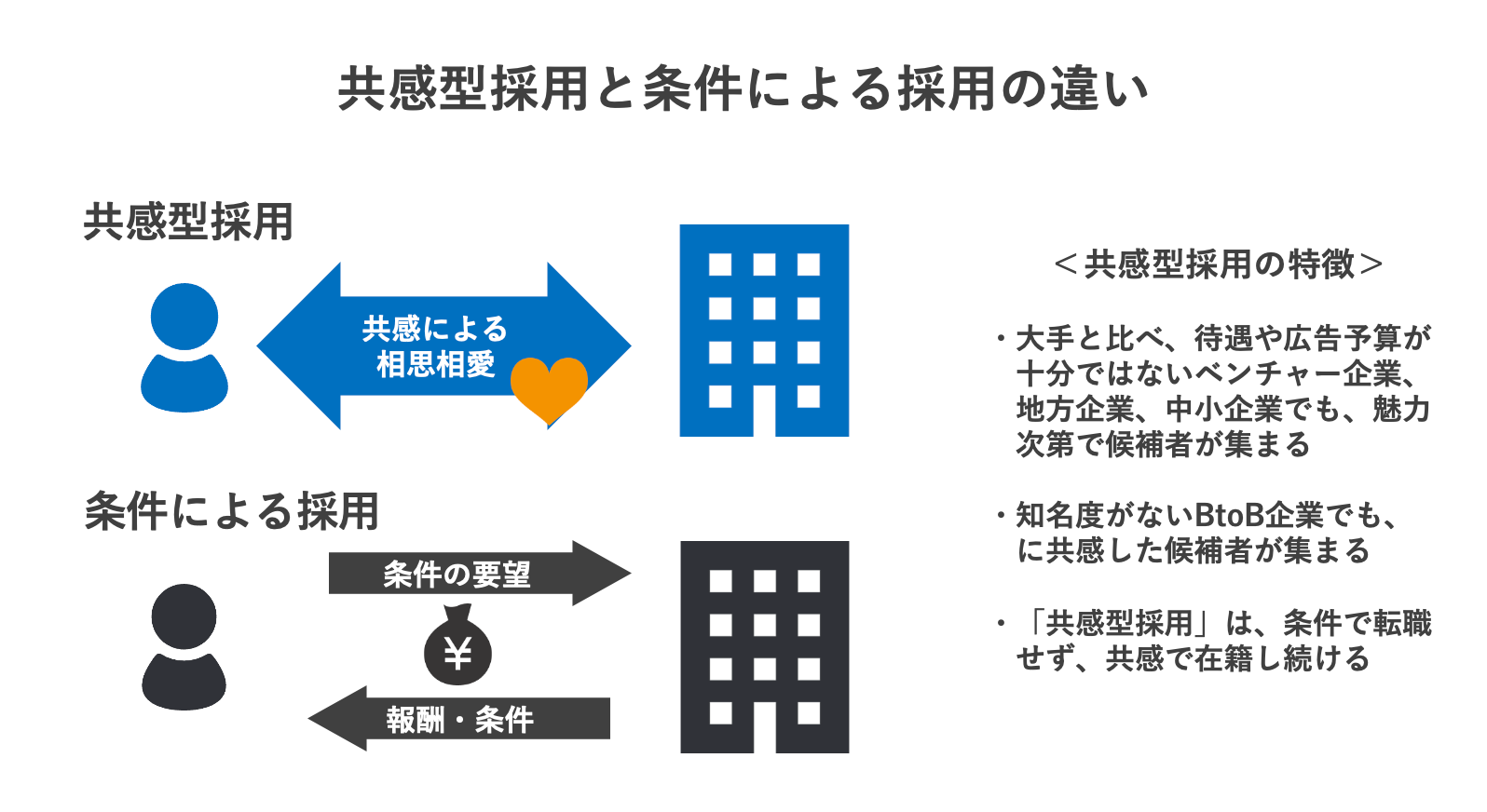 「条件による採用」で採用した人物は、もっと良い条件で転職してしまうが、「共感型採用」は共感が維持される限り、在籍し続ける。
