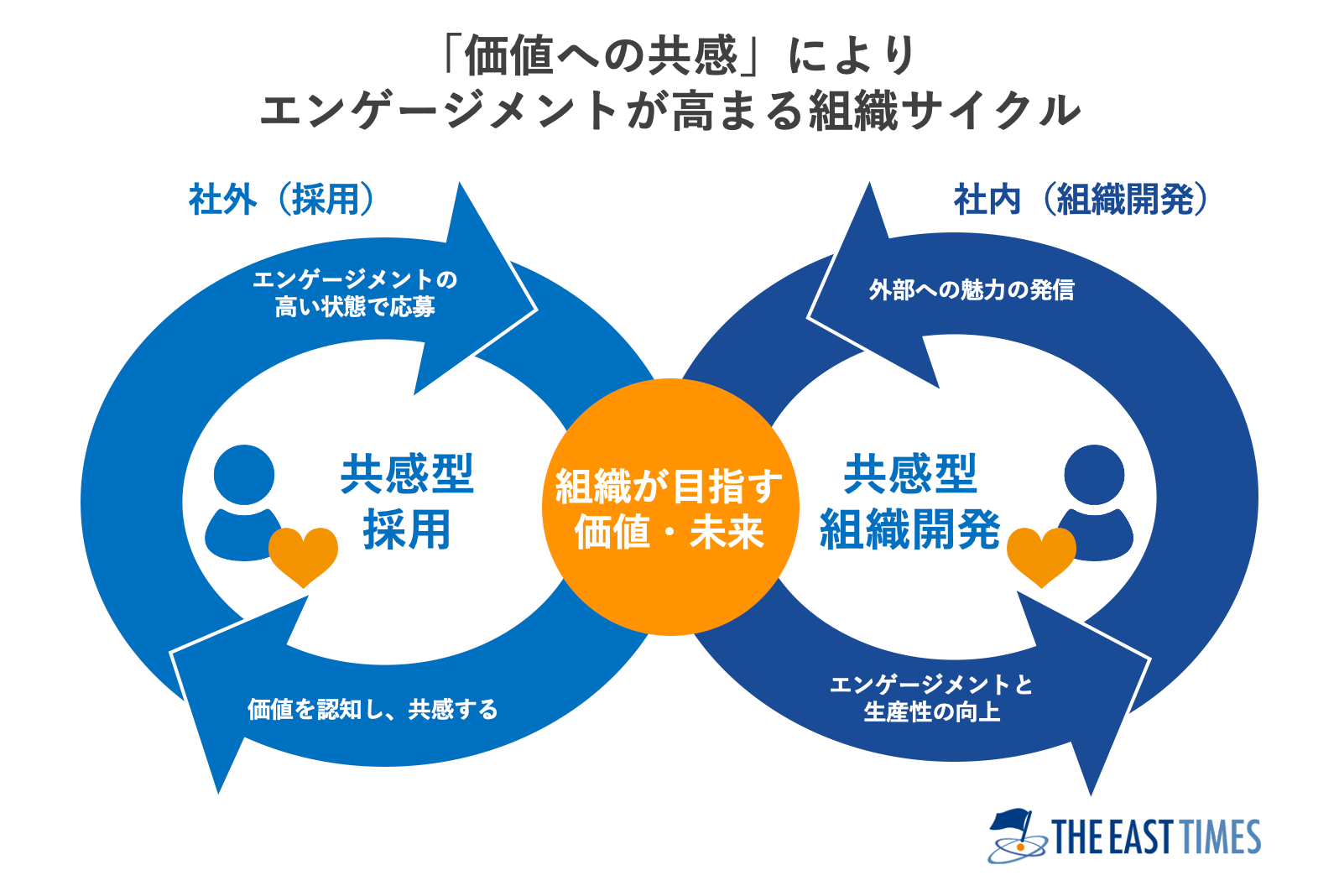 イーストタイムズが提供する「共感型採用」は、その組織の目指す「価値」を言語化・ストーリー化し、発信することで、「価値」に共感する候補者を採用するサービスです。