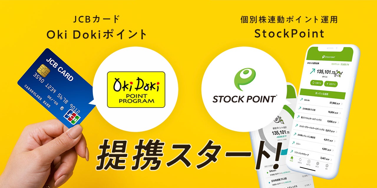 株式会社ジェーシービー (本社:東京都港区、代表取締役会長兼執行役員社長:浜川 一郎、以下:JCB) と、世界初の株価連動型ポイント運用サービス「StockPoint」を提供するSTOCK POINT株式会社(本社:東京都港区、代表取締役:土屋 清美、以下:STOCK POINT)は、JCB のポイントプログラム「Oki Dokiポイント」を「StockPoint」に交換できるサービスを、2021年12月16日(木)より開始することをお知らせいたします。
