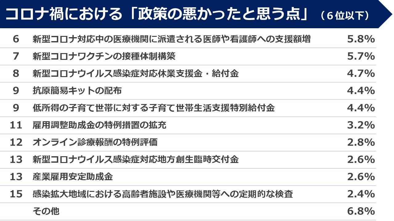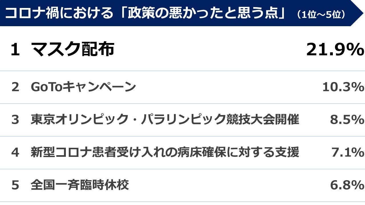 コロナ禍における政策の悪かったと思う点について、もっとも多く票を集めたのは「マスク配布」という結果になりました。