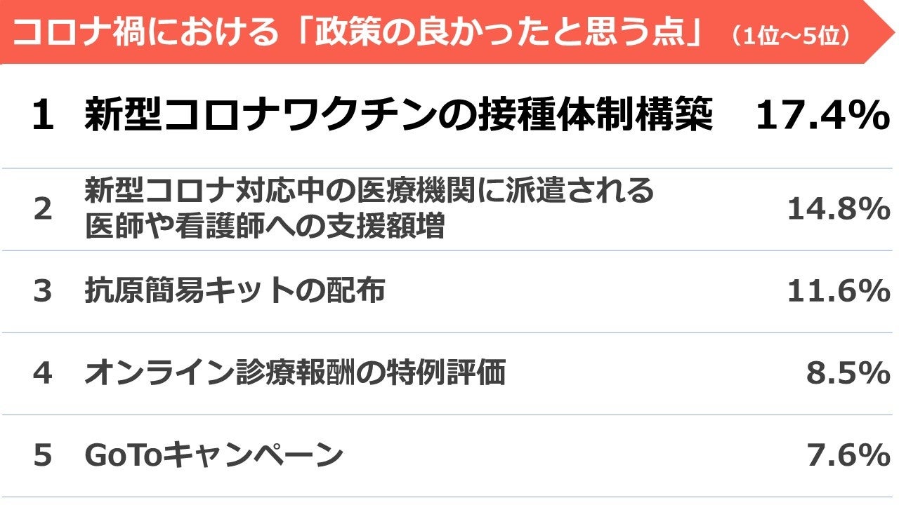 コロナ禍における政策の良かったと思う点について、もっとも多く票を集めたのは「新型コロナワクチンの接種体制構築」という結果になりました。