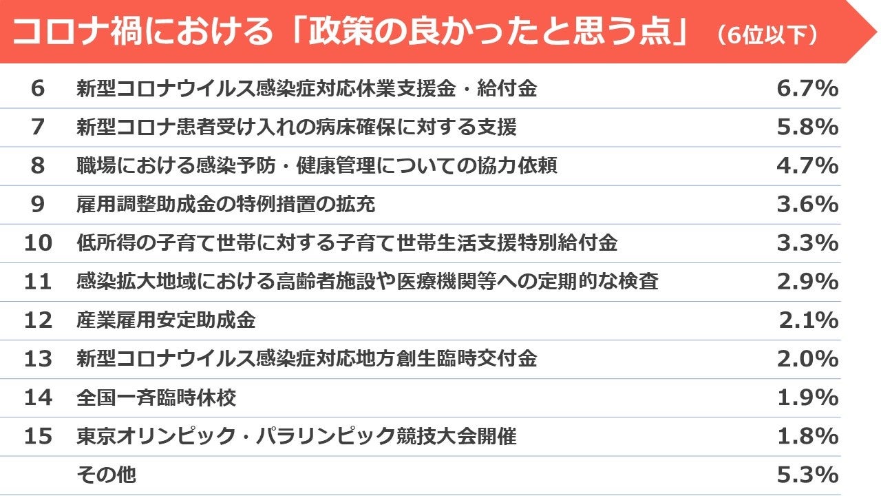 上記でご紹介した以外にも、「大変な中、政府は臨機応変な対応をしてくれていた」、「命を守る政策により感染対策への意識が高まった」等のご意見がありました。
