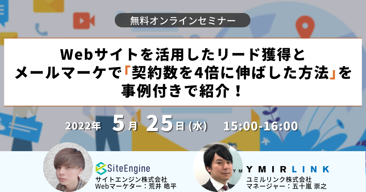 「改善のタネを広める」を経営理念としてWebマーケティング支援サービスを提供するサイトエンジン株式会社(本社:東京都世田谷区 代表取締役:毛塚智彦)は、2022年5月25日(水曜)15:00~16:00に、ユミルリンク株式会社(本社:東京都渋谷区 代表取締役:清水亘)との” Webサイトを活用したリード獲得とメールマーケで契約数を4倍に伸ばした方法を事例付きで紹介!” を開催します。