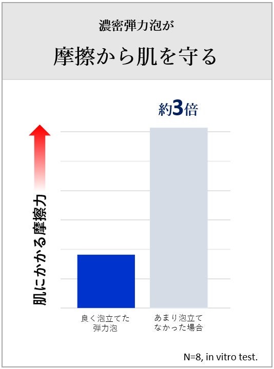 | 【コラム】洗顔の“泡”の違いだけで、角質への摩擦ダメージは“約3倍”も変わる! 毎日何気なく行っているスキンケア。肌悩みができると使っている製品を見直す人は多いですよね。 しかし使っている製品を変えなくても、肌に触れるときの力加減や洗い流すときの水温などのお手入れ方法を変えるだけで、肌の美しさは大きく変わるって知っていましたか? 実はよく泡立てずに洗顔をした場合、しっかり泡立てた濃密な弾力泡に比べて、角質へのダメージが約3倍もかかってしまうという事実もわかっています。 肌表面の角質層は、肌のうるおいを保ち、外的刺激からの肌を守る機能をもつ、非常に重要な細胞です。ですが、その薄さは0.02㎜ほどしかなく非常に繊細で傷つきやすいのです。角質層が傷つくと、バリア機能が低下するため外的ダメージを受けやすくなり、乾燥やくすみ(※5)、毛穴の目立ちなどさまざまな肌トラブルを引きおこすことに繋がります。 特に汚れを落としたい一心でごしごしと肌を擦ってしまいがちなクレンジングや洗顔のスキンケアステップでは、デリケートな角質をよりやさしく丁寧に扱うことが重要です。 洗顔時のポイントとして、クッション代わりとなる濃密でへたりづらい泡をつくり、手のひらと泡で肌を包むようにして手が直接肌に触れないように、優しくなじませることを心がけてください。汚れをしっかり落としながらも、角質への摩擦ダメージを最大限に和らげながら洗い上げることができます。 |