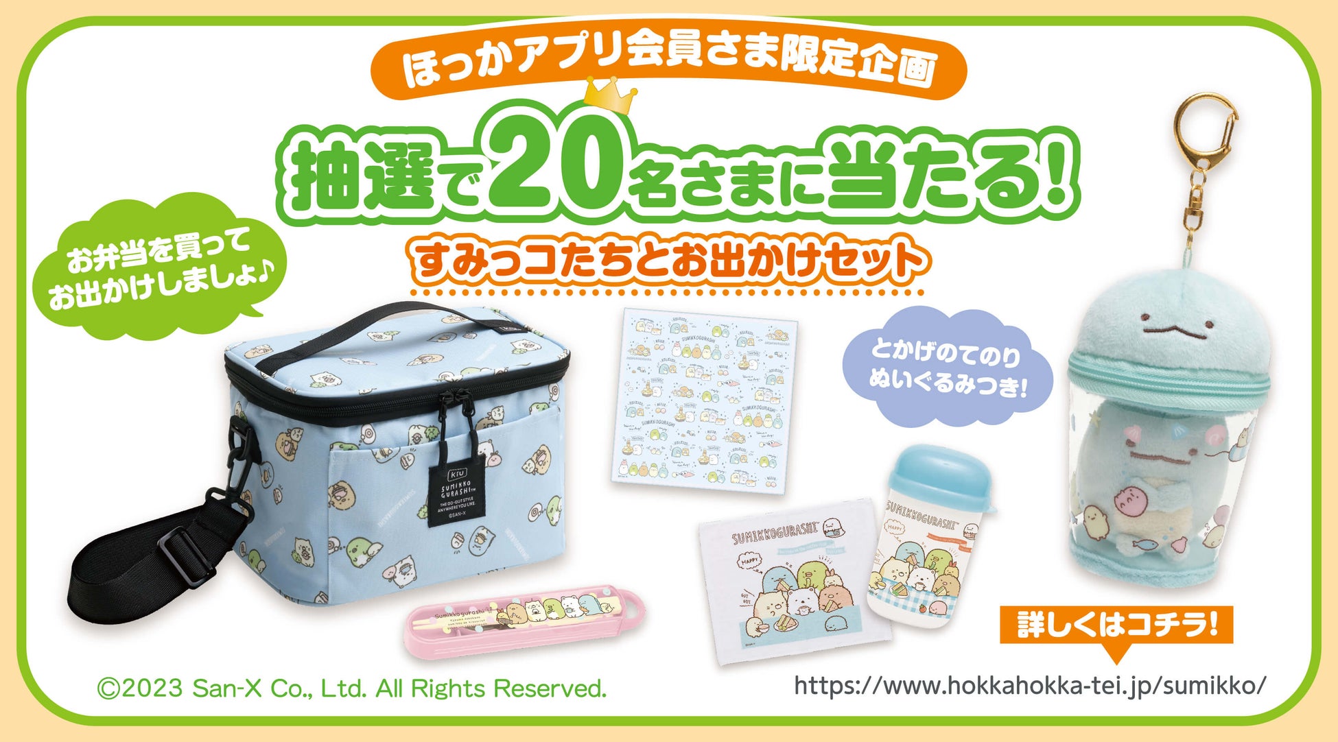 また、同時に、ほっかほっか亭公式アプリ「ほっかアプリ会員さま限定企画」を実施。すみっコぐらしオリジナルマルチケースに同梱されている応募シリアルコードを、ほっかアプリのキャンペーン特設ページに入力のうえご応募ください。抽選で20名さまに、「すみっコたちとお出かけセット」をプレゼントいたします。どしどしご応募ください。