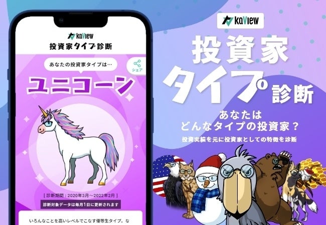 投資実績やポートフォリオなどのデータを元に診断を行い、投資家としての特徴を20種類以上のタイプに分類するカビュウオリジナルコンテンツです。診断対象は直近2年間のデータで、毎月1日に更新されます。