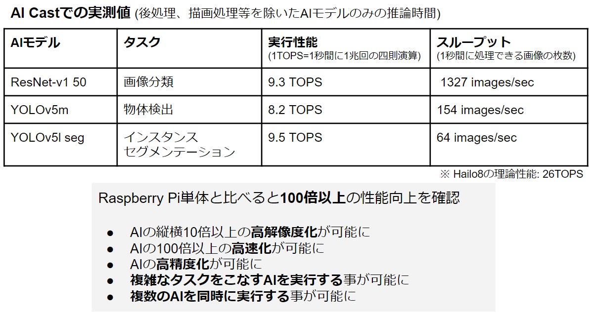 ai castには汎用コンピュータ「Raspberry Pi(通称:ラズパイ)」に加えてAIアクセラレーターチップ「Hailo-8」が搭載されており、Ideinの得意とする高速化技術と相まって、AIカメラの実測性能100倍以上の向上を実現しました。これにより、顔認証、深度推定、姿勢推定、暗所での分析、属性分析等の大幅な精度向上が見込めます。