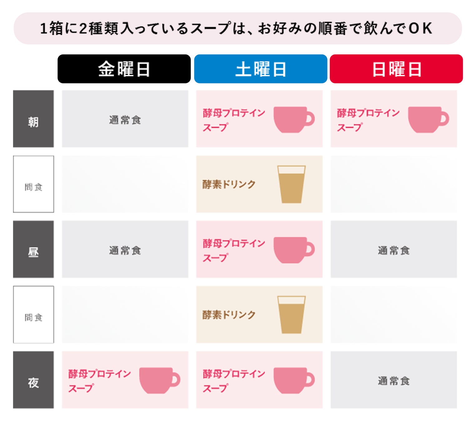 3日間や1週間といったファスティング期間だとチャレンジするタイミングが難しく、準備食や回復食といったファスティング前後の準備も面倒、空腹にも耐えられないといったハードルの高いものでした。RAKUFASはわずか1.5日間で、手間なしで気軽にできるファスティング。朝・昼・夜に飲むスープのほかに、間食用としてほのかに甘さを味わえる酵素ドリンクもセット。お腹も気持ちも満たすファスティングプログラムです。