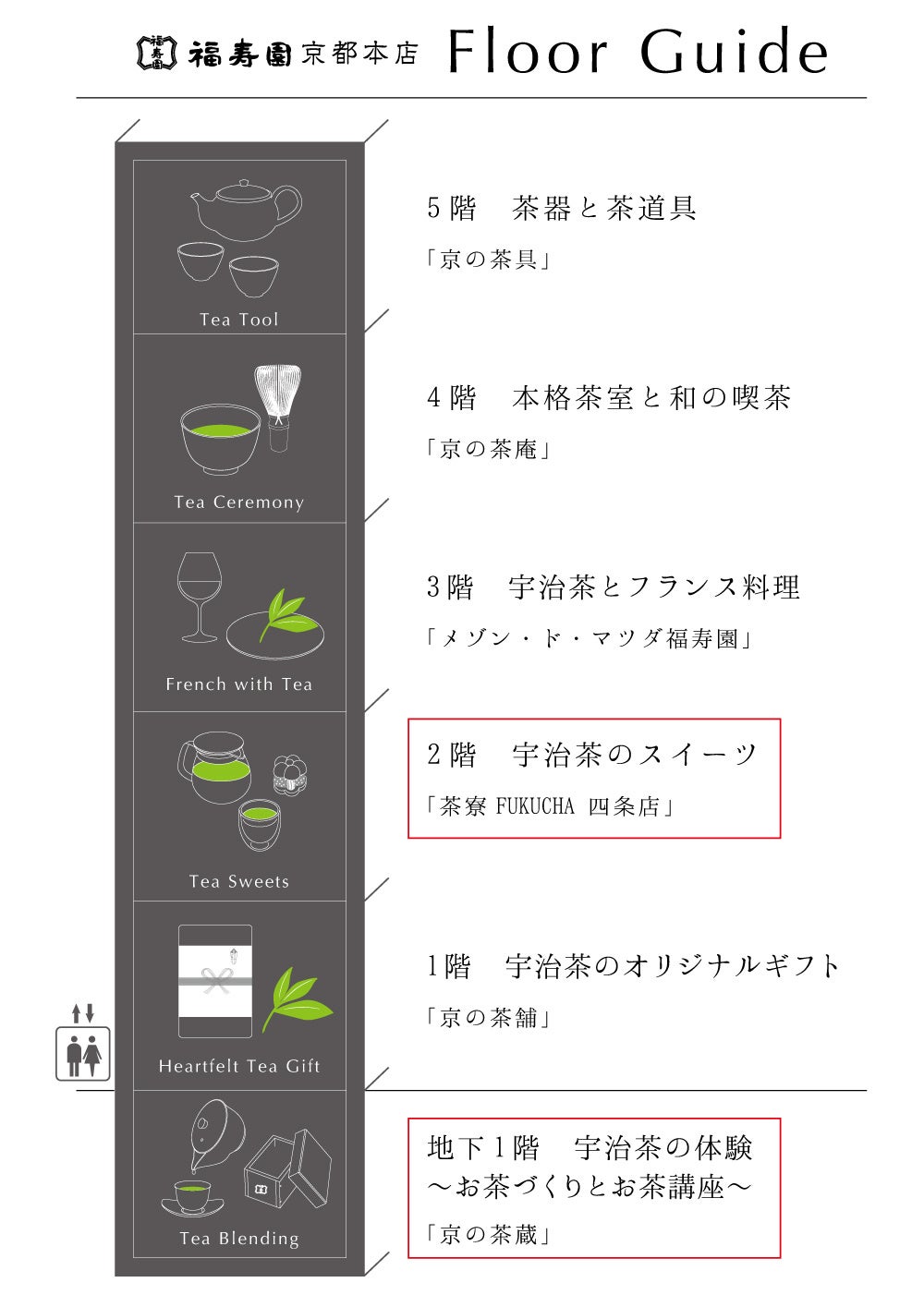 福寿園京都本店は、地下1階~9階の建物で、京の王朝文化と宇治茶を融合させた設えの中、様々な体験をご提供しています。地下1階「京の茶蔵」では、日本茶インストラクターが常駐しており、お茶について学ぶ講座とお好みのお茶づくり体験をお楽しみいただけます。