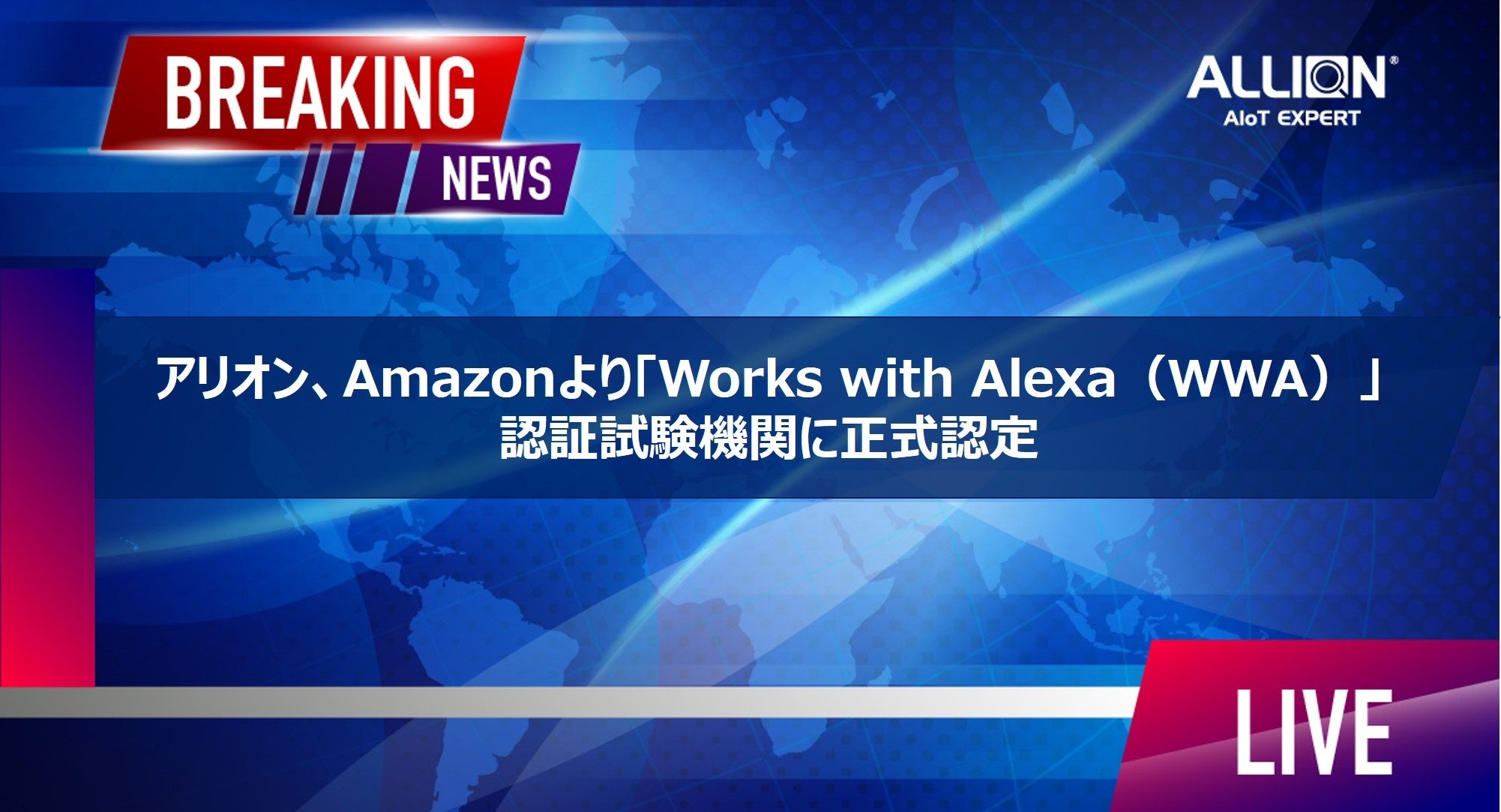 認証試験、品質検証、およびコンサルティングの総合的な第三者検証ソリューションを提供するアリオン株式会社(東京都 品川区、代表取締役社長:中山英明、以下「アリオン」)のグループ本社であるAllion Labs Inc.(本社:台湾・台北市、CEO:Summer Chien)は、本日、Works with Alexa(以下、WWA)の認証試験機関(Authorized Test Lab、略ATL)としてアマゾンより正式に認定されました。この認定により、アリオンは包括的なWWA認証試験サービスの提供を開始し、法人のお客様が認証プロセスを効率的に進めるとともに、Alexaエコシステムとのシームレスな互換性を確保できるよう貢献します。