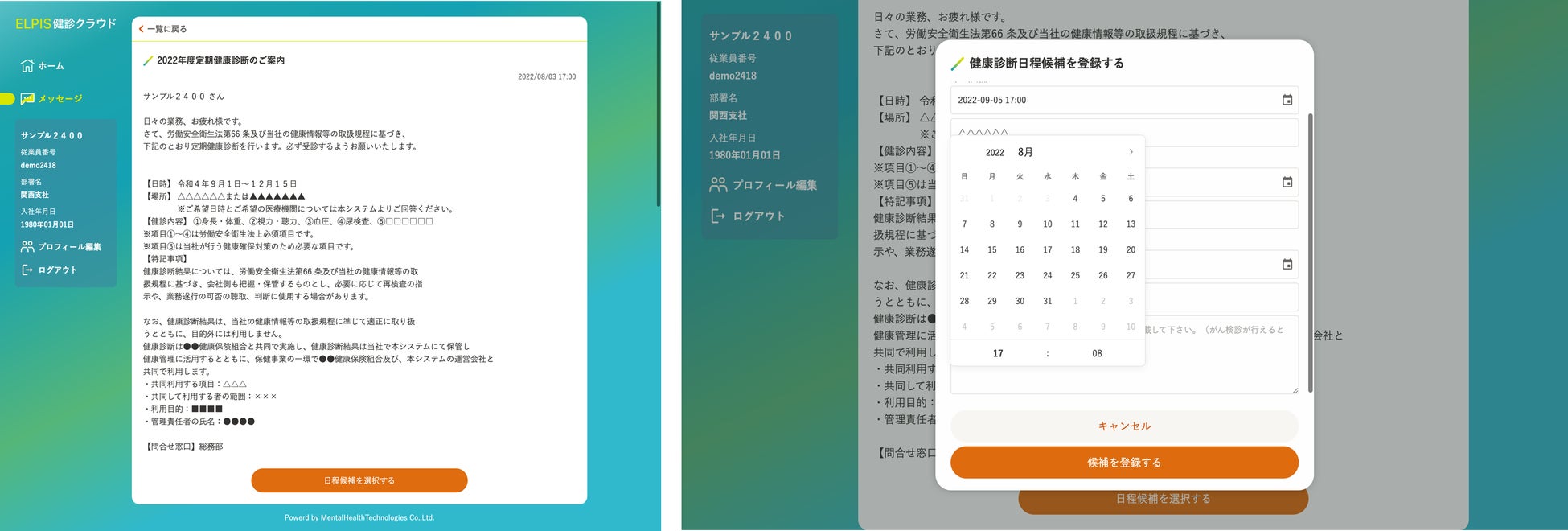 受け取ったメッセージから希望の日時や医療機関を申告でき、人事担当者と健診日・健診場所の調整が円滑化。