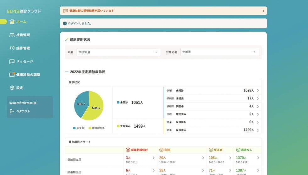 「ELPIS-健診クラウド」はその管理画面上で、人事担当者がクラウド上に登録された各社員の健康診断データを組織別、個人別に確認できます。また、産業医・保健師との円滑な情報共有・連携、就業判定の自動化機能により追加対応が必要な社員に自動的にアラートを上げることで、早期に従業員の健康状態の異常を察知し予防を促すことも可能です。本年度中に100社への導入を目標としています。