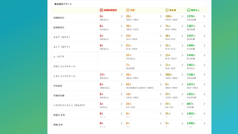 ダッシュボード画面は、健康診断に関する情報を一元的に把握できるよう一覧性の高いデザインを採用しました。円グラフで社内の健康診断の受診・未受診の状況を表す他、”重点項目アラート”再受診等が必要な社員がどの程度存在するのか会社全体・部署毎に把握できます。