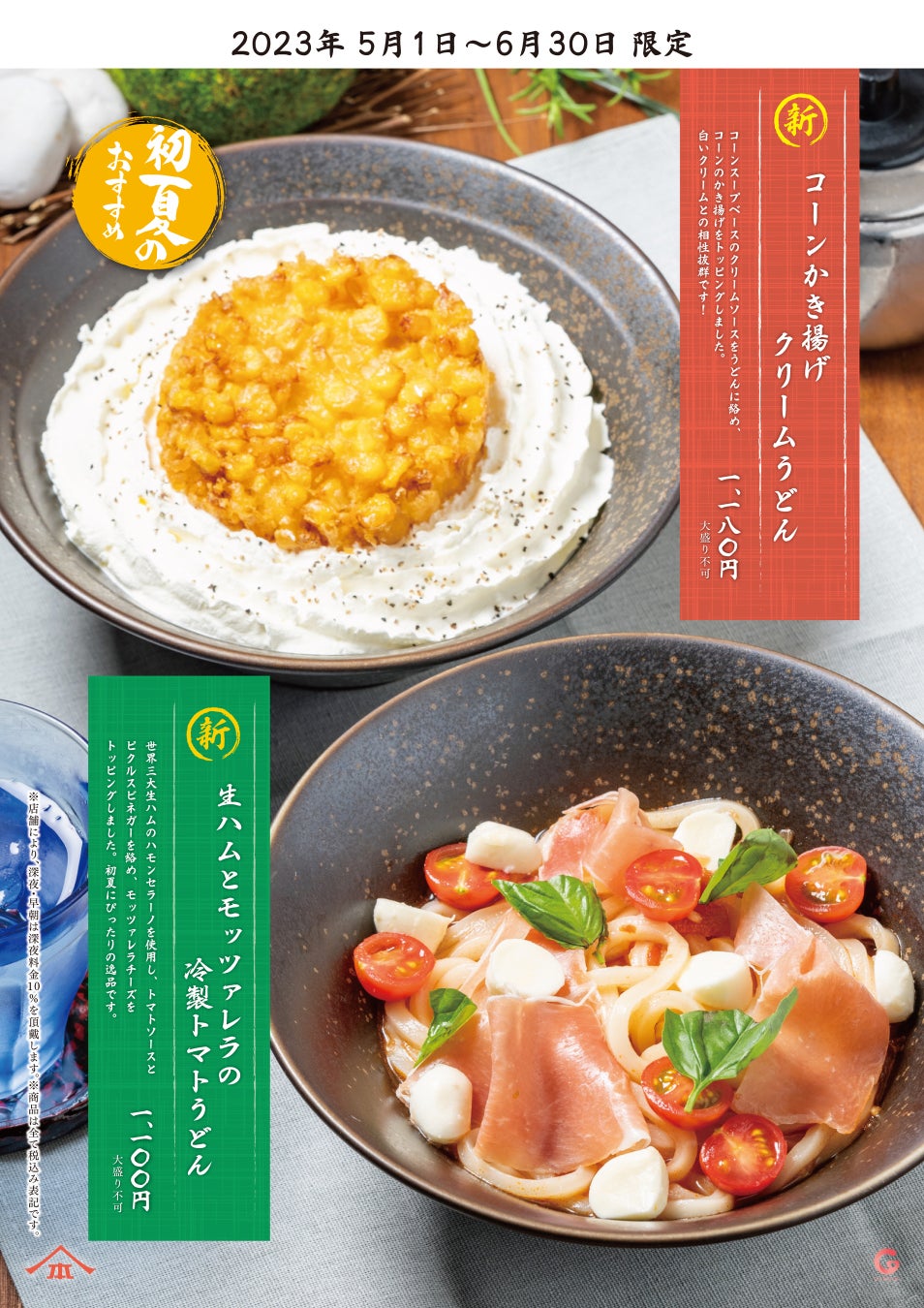 5・6月限定『コーンかき揚げクリームうどん』と『生ハムとモッツァレラの冷製トマトうどん』5月1日(月)より新発売
