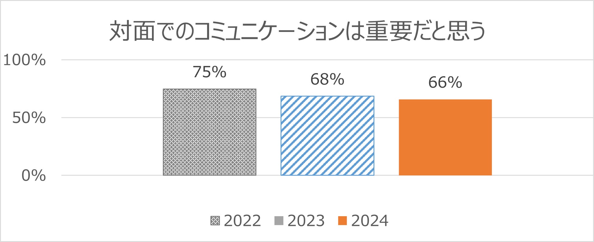 意識面においても、いくつかの項目において、低下が見られました。中でも、過去二年間に渡り大きく低下した意識として、「対面でのコミュニケーションは重要と思う」が75%(22年)から66%(24年)と二年間で9pt低下しています(グラフ4)。コロナ禍中、対面でのコミュニケーションが制限されるほど、逆にその重要性を感じていたものの、制限がなくなった今、リモートワーク・授業の定着とともに、対面での価値を感じる人が減少しているものと推察します。