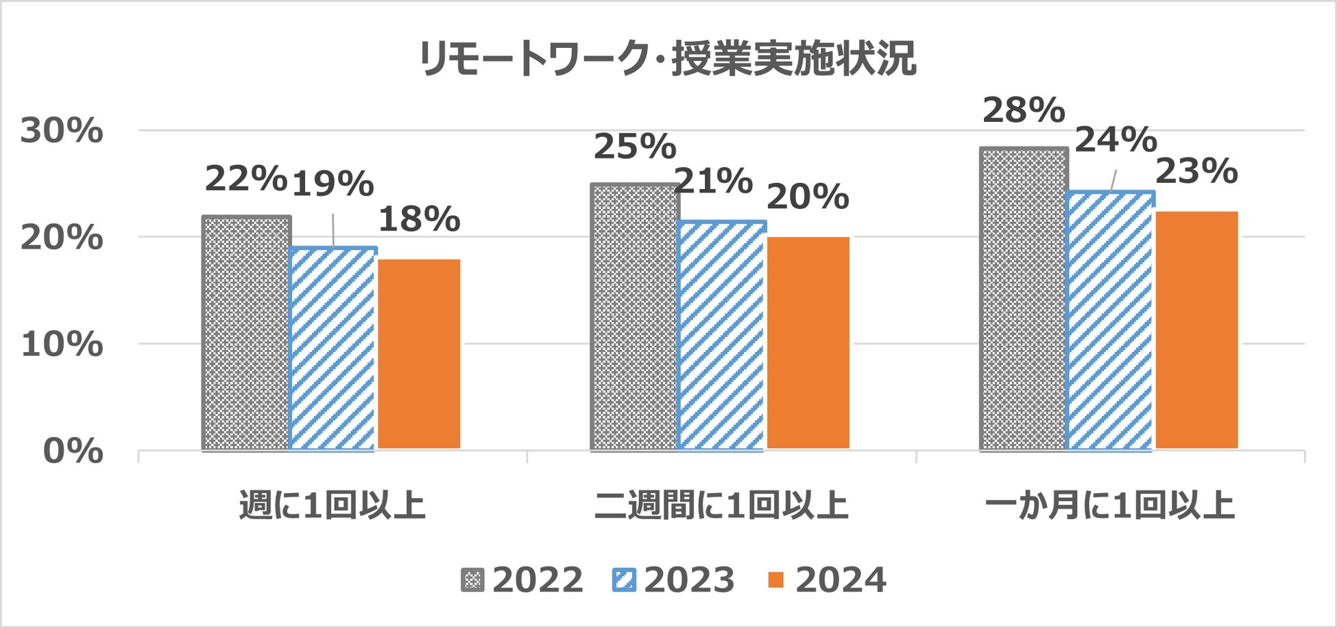 リモートワーク・授業実施率は、一か月に1回以上の実施で24%(24年)でした(グラフ1)。二年前からは5pt低下しているものの、一年前からはほぼ変化がなく、リモートワーク・授業は一定の層においては定着したと言えそうです。