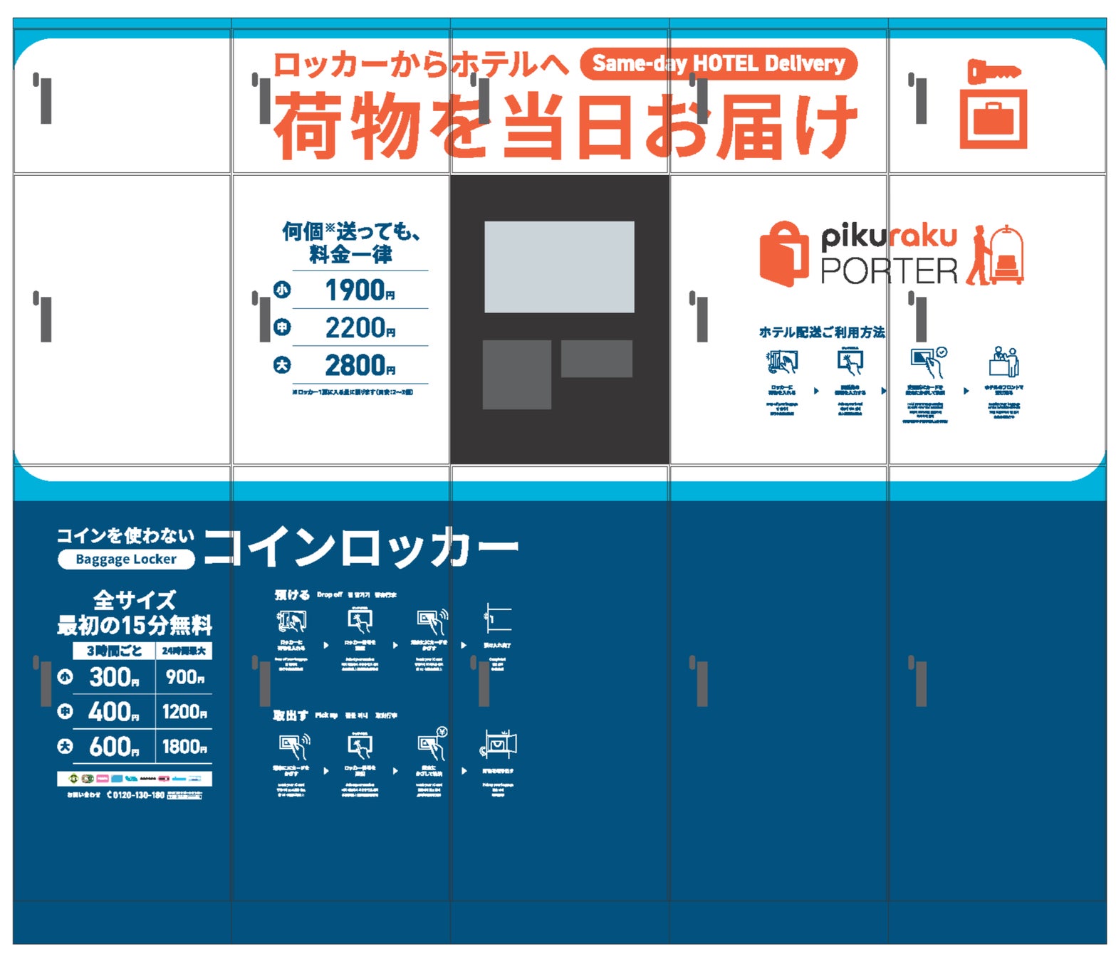 14時までにロッカーに預けた場合、東京エリア約500ホテルの中から指定した宿泊先へ、原則19時までにホテルへ配送