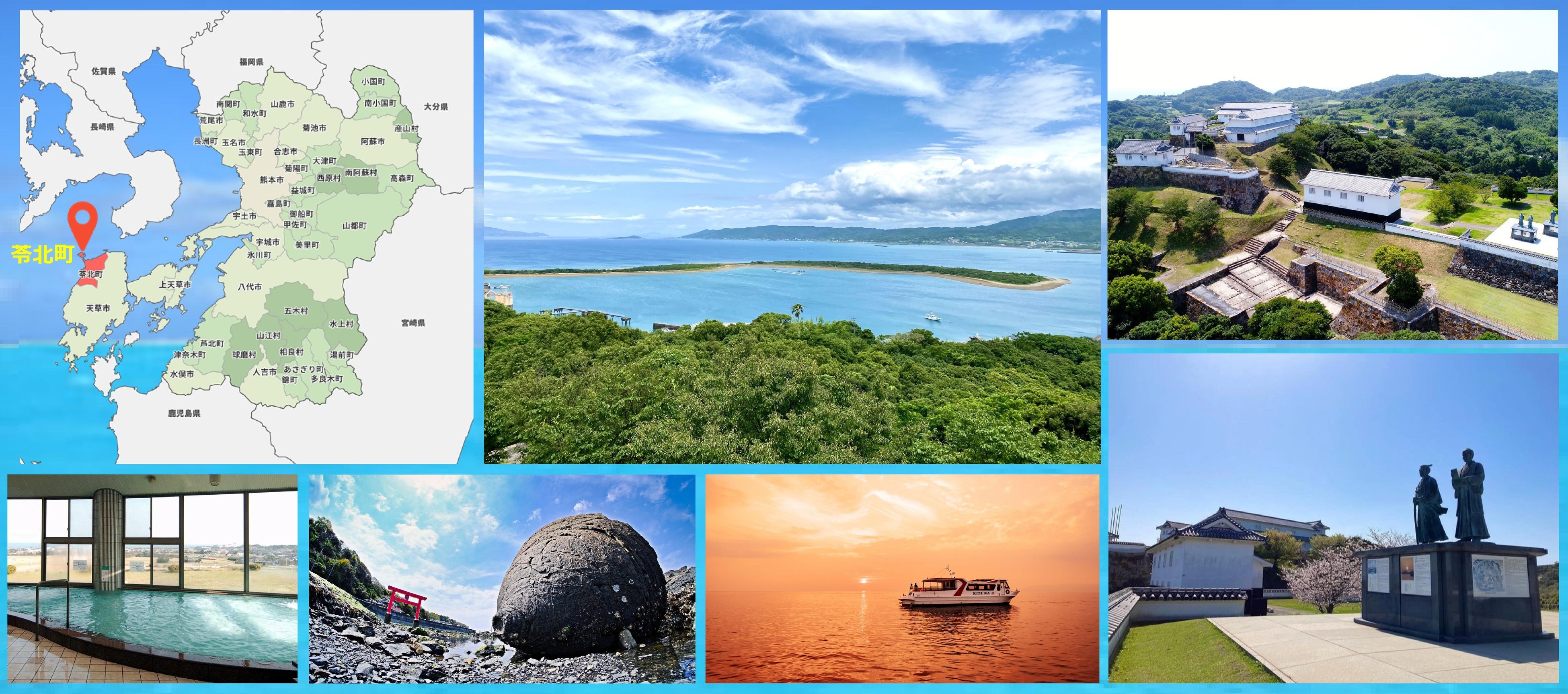 天草郡苓北町は、熊本県の南西部に点在する天草諸島のうち、最も大きな島である天草下島の北西端に位置しており、人口は6,376人(令和6年2月末現在)、西は天草灘をのぞみ、北は千々石灘に面した美しい海に囲まれた町です。苓北随一の観光名所といえば、明治維新前に天草行政の中心地であった「富岡城」があげられます。その城郭から見下ろす、美しい海や地形は、苓北ならではの絶景です。
