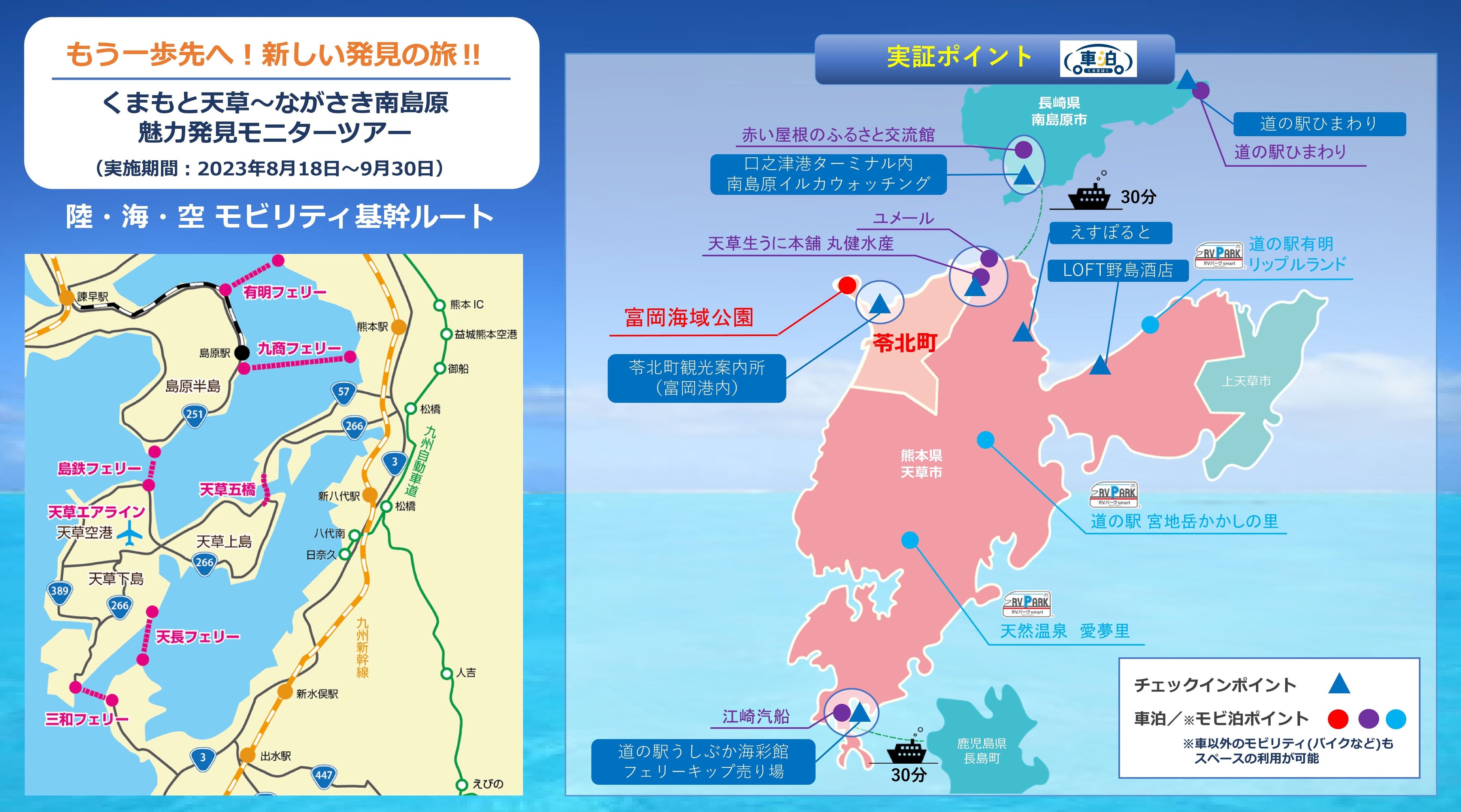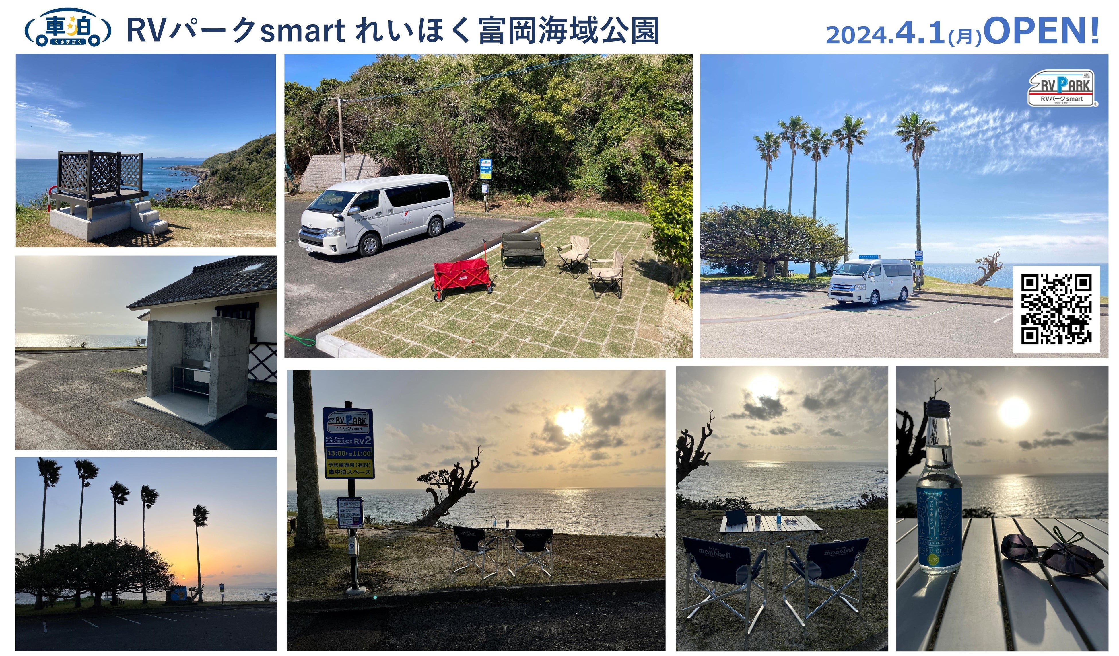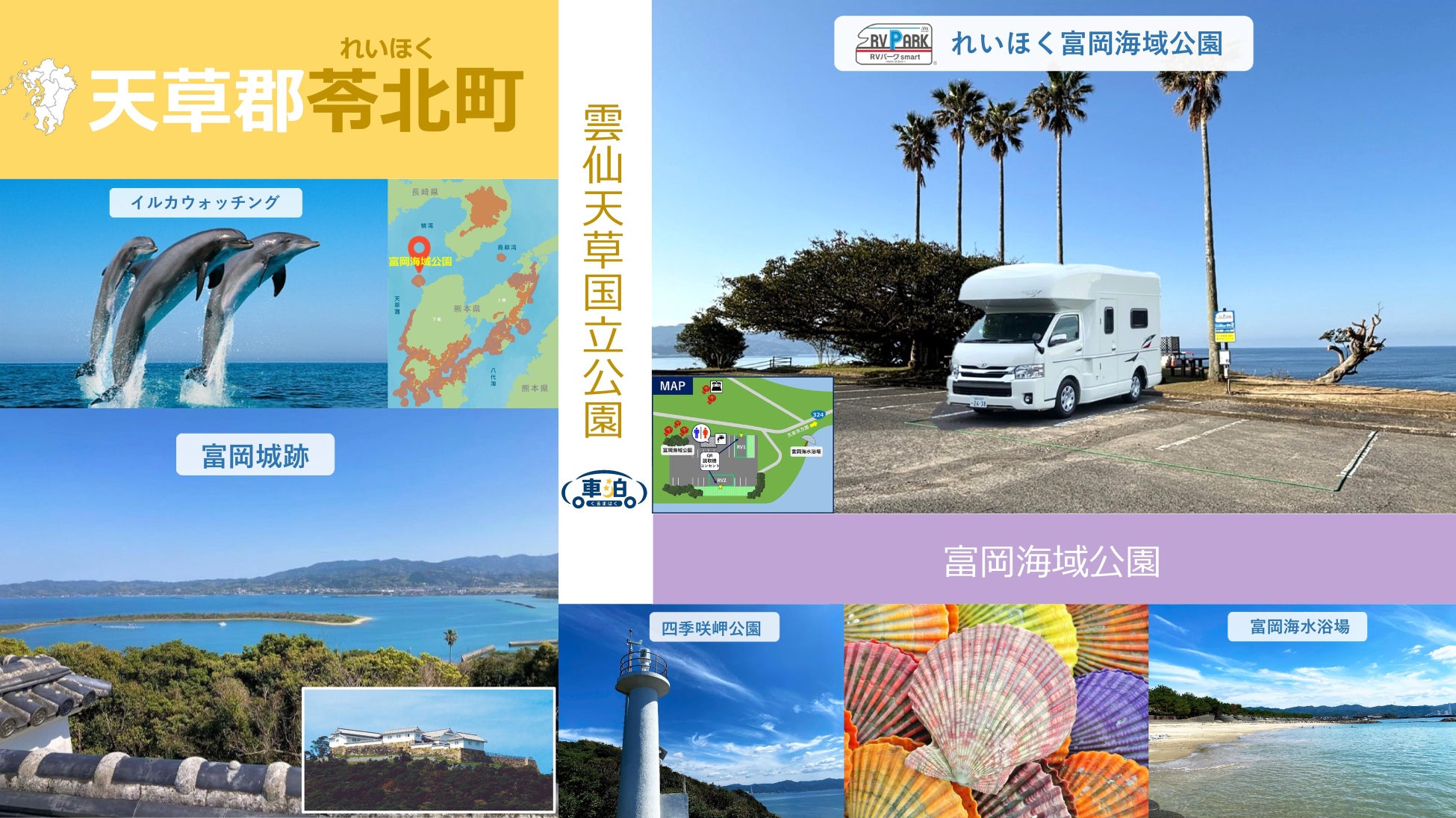 九州周遊観光活性化コンソーシアム(代表機関:トラストパーク株式会社 本社:福岡県福岡市博多区、代表取締役:山川 修)と熊本県天草郡苓北町は、多様化する旅客ニーズに対応した宿が少ないという課題を抱える天草エリアにおいて、新たな滞在スタイルや、観光・防災拠点として、雲仙天草国立公園「富岡海域公園」の駐車場に安心・安全に車中泊ができる「車泊(くるまはく)」・ RVパークsmart を導入し、2024年4月1日よりWebサイトで予約受付を開始しました。国立公園の公共施設におけるRVパーク開設は国内初事例となります。