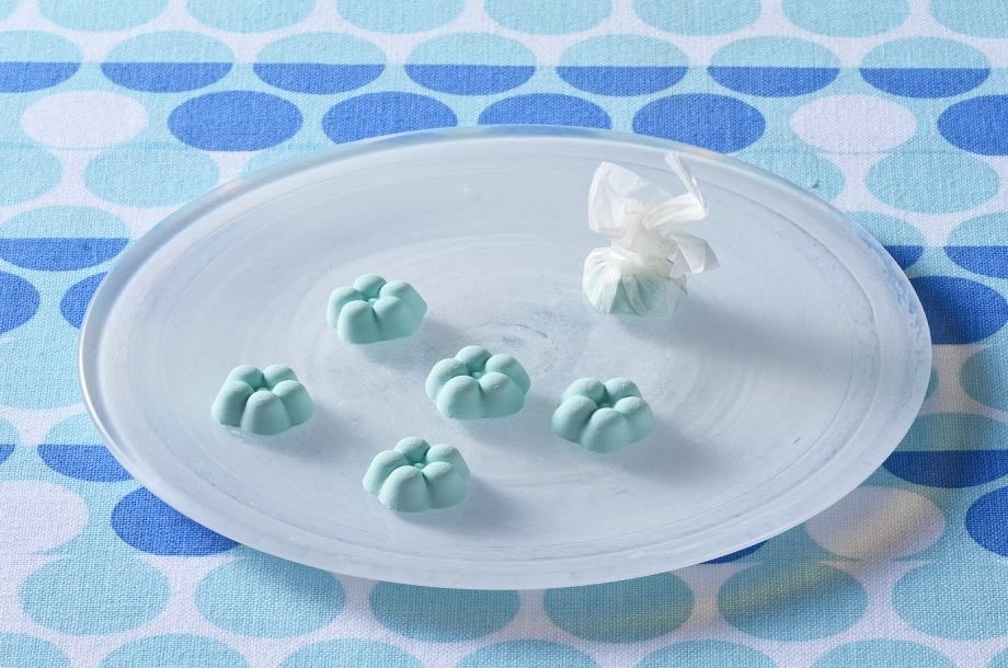 爽やかなソーダの風味の落雁です。可愛らしい巾着型のパッケージにお詰めいたしました。夏におすすめの一品です。