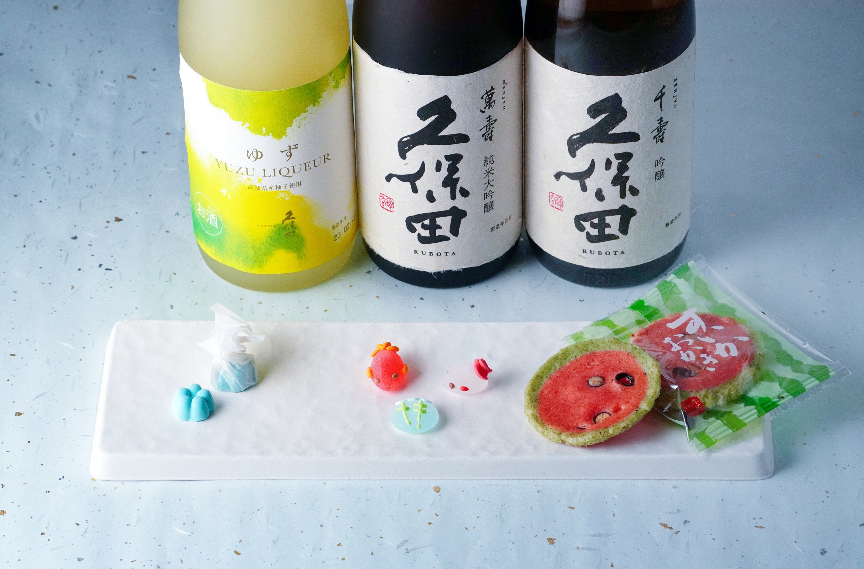 2回目となる文月は、「にっぽんの夏」をテーマに、爽やかで遊び心のある和菓子に「久保田」をカジュアルに合わせてお楽しみいただきます。石川「落雁諸江屋」の「ラ・クガン(ソーダ)」は、爽やかなソーダ味で『久保田 ゆずリキュール』の炭酸割りとマッチして瑞々しさが引き立ちます。京都「俵屋吉富」の「糖蜜ボンボン 金魚づくし」は、噛むと糖蜜の程よい甘さがとろけて、『久保田 萬寿』の奥深い味わいと調和します。大阪「あられとよす」の「すいかおかき」は、あっさり塩味で、すっきりとした『久保田 千寿』とよく合います。また、3種類の飲み比べセットでそれぞれの久保田の味わいもお楽しみいただけます。厳選した夏の和菓子とともに久保田をゆっくりとお楽しみください。