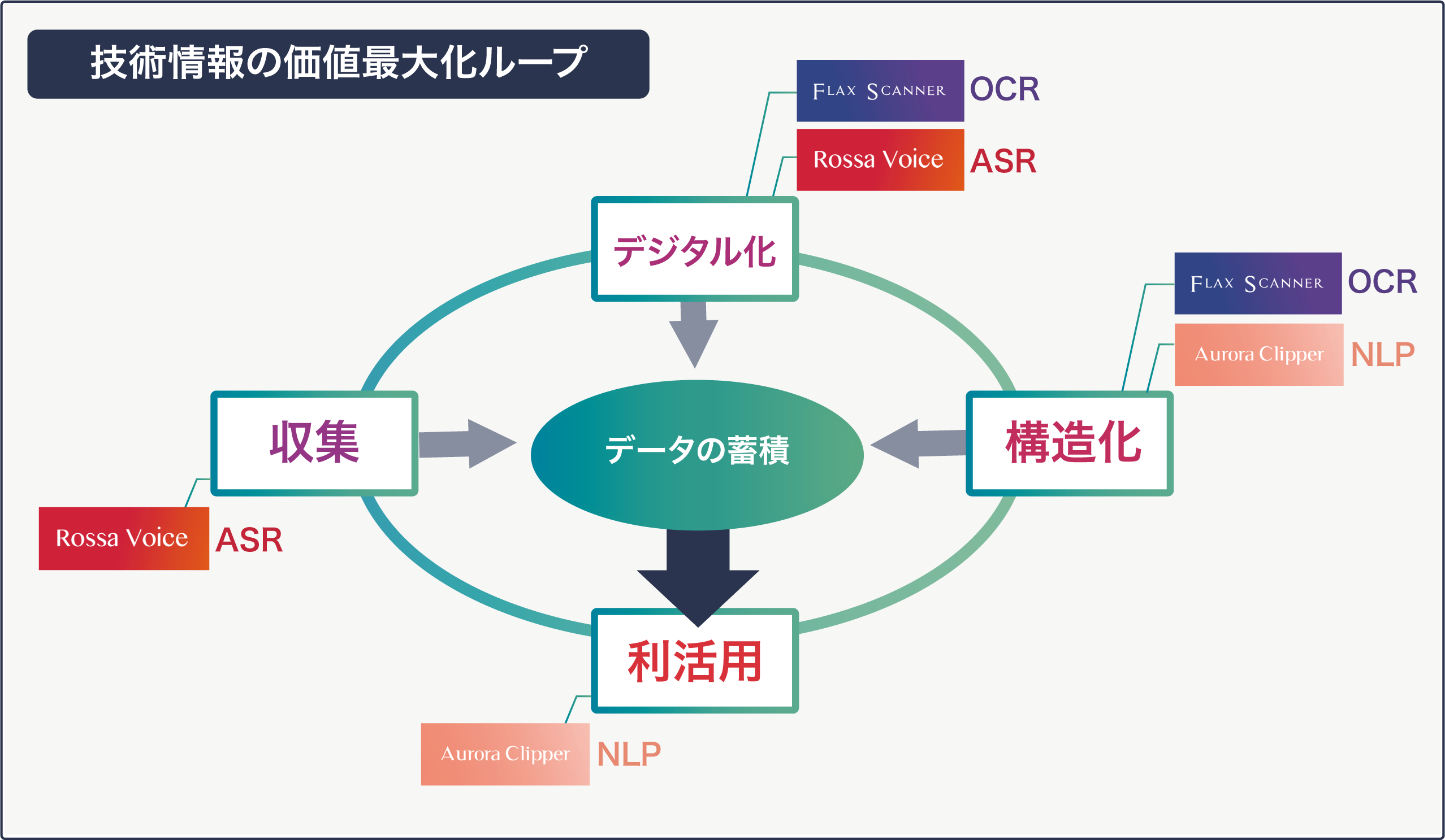 技術情報の価値最大化においては、データに対する多角的なアプローチが不可欠です。MITA ソリューションでは、情報を収集し、デジタル化したものを構造化して活用に繋げます。そして蓄積・活用のサイクルの実現に向けた「情報の資産化ループ」を生み出します。