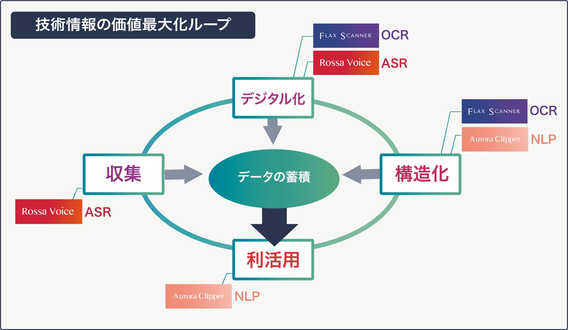 自社開発の音声認識エンジン「Rossa Voice」を製造業界専用に特化して学習させることで、専門用語や社内用語を高精度に認識します。更に情報量が多くなる将来、テキストの記録だけに頼るのではなく、声を用いた情報の資産化を行う事でよりデータドリブンな意思決定を支援します。