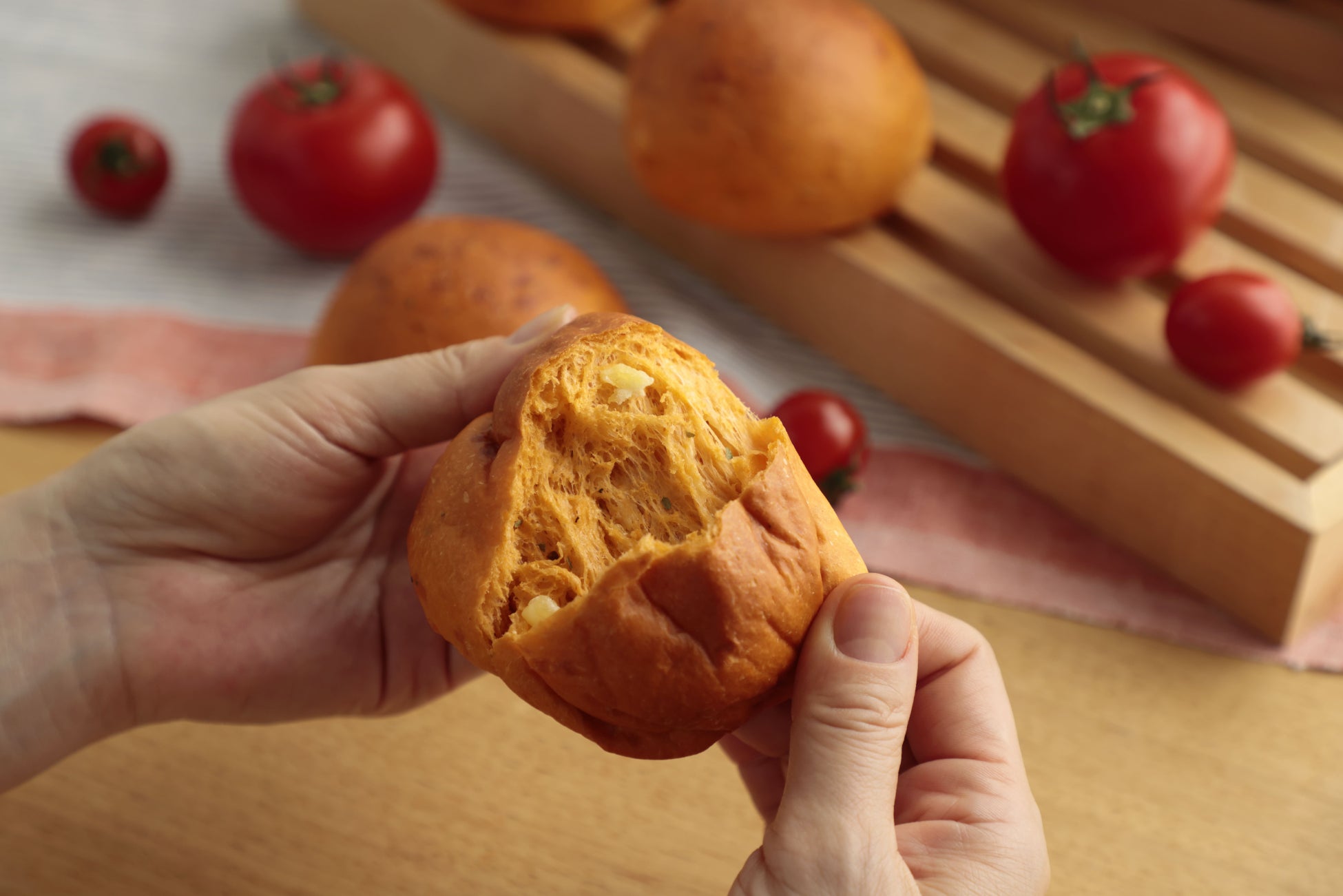 トマトのうまみをギュッと凝縮したもっちり生地に、ゴロゴロとしたダイスチーズとバジルを配合。洋風でしっかりとした味わいで、そのままでも満足感がありますが、チキンやレタスをサンドしても更に美味しくお召し上がりいただけます。