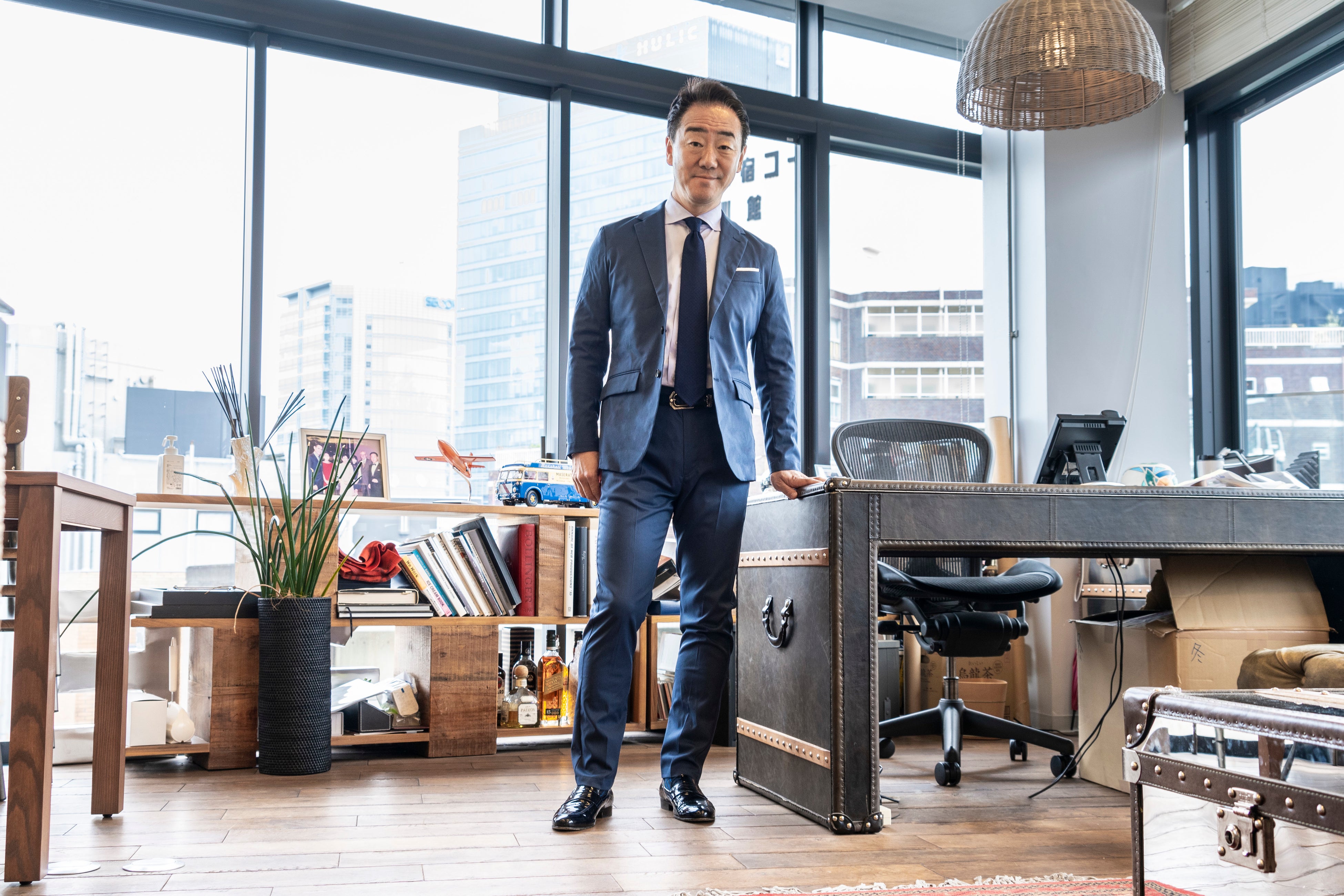 「ありそうでなかった着眼点で作られたスーツ。2年間毎日洗濯できて、ノーアイロンでOK!」とその機能性とスタイリッシュさに惚れ込んだ社長の新川自身も、Bizモデルの新色・ビターチャコールを好みのワントーンコーディネート、小物で大人の遊びをプラスして、その着心地の良さを楽しんでおります。