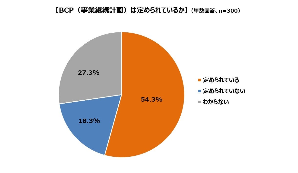 その結果、リモートワーク中の防災対策をしている企業が3割にとどまっていること、災害が起きた際の対応方法について、管理職では約7割が知っていると回答したのに対し、一般社員では半数以上が知らないと回答し、管理職と一般社員との間で差があることがわかりました。また、BCP(Business Continuity Plan:事業継続計画。災害時の事業継続、事業復旧に関する計画やマニュアル)は、「定められていない」・「わからない」をあわせて約5割にのぼり、企業の災害対応準備はやや不安な状況であることがわかりました。