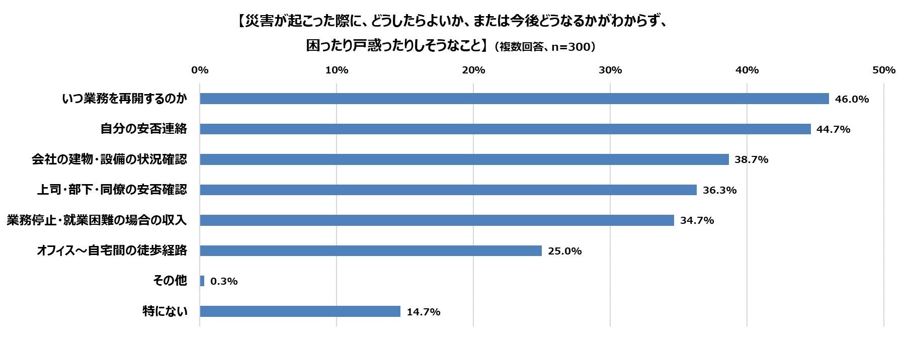 災害が起こった際に、どうしたらよいか、または今後どうなるかがわからず、困ったり戸惑ったりしそうなことを聞いたところ、最も多かった回答は「いつ業務を再開するのか」46.0%、次いで「自分の安否確認」44.7%、「会社の建物・設備の状況確認」38.7%でした。TOP3の項目はルールが明文化され、社員がしっかり認識をしていれば解決できそうな項目ですが組織において、業務開始時期を決定する責任者や安否連絡の方法などのルールが認識されていないのかもしれません。また、「特にない」の回答に注目すると14.7%で、8割以上が災害時に不安を抱いていることがわかります。