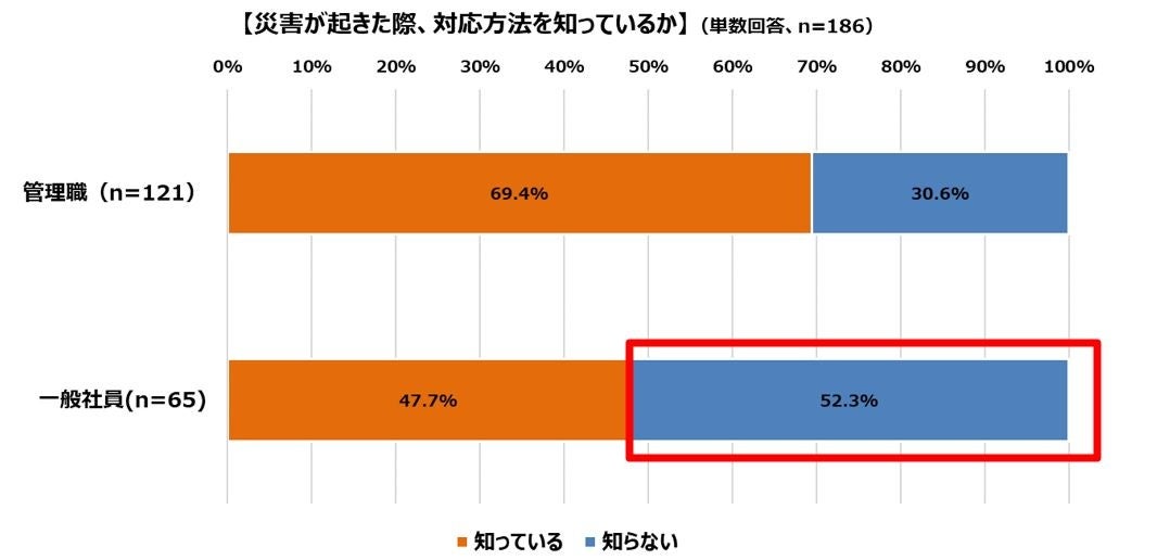 ・災害が起きた際の対応方法を知っている管理職 約7割、一方一般社員は半数以上が知らないと回答