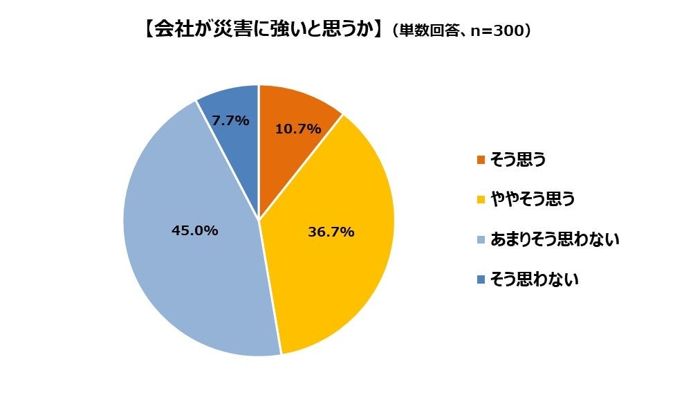 自社が災害に強いと思うか聞いたところ、「そう思う」10.7%、「ややそう思う」36.7%、「あまりそう思わない」45.0%、「そう思わない」7.7%で半数以上の方が災害に強いと思わないと考えていることがわかりました。