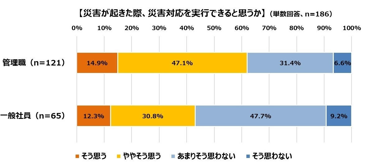 災害対応を実行できると思うかを聞いたところ、管理職は「そう思う」14.9%、「ややそう思う」47.1%で約6割の方が実行できると思うと回答しているのに対し、一般社員は「あまりそう思わない」47.7%、「そう思わない」9.2%で約6割の方が実行できると思わないと回答していることがわかりました。Q5の「災害が起きた際の対応方法を知っているか」でも管理職と一般社員との間で回答割合に差がありました。マネジメント層は有事の際にも部下の安全を管理するポジションであることから災害時の対応方法を認識し、実行できるように準備していることがうかがえます。しかし、一般社員まで対応方法を周知し実行できるような訓練を行っていないと、いざという時に機能しない恐れがあるかもしれません。