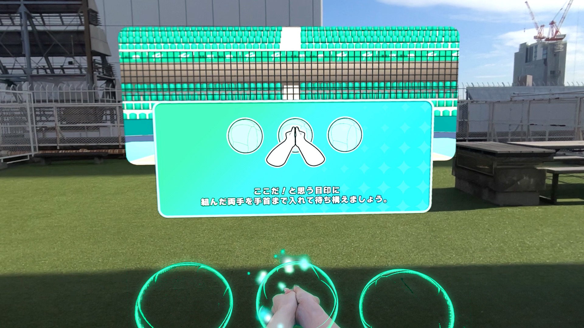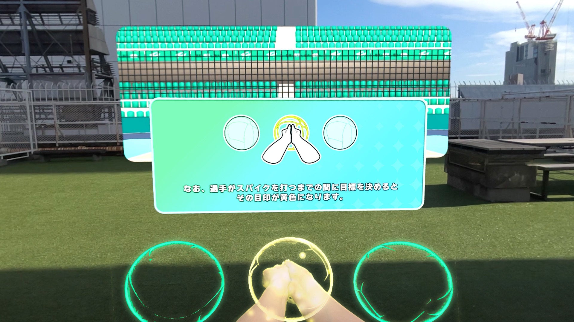 対戦が始まると、目の前にスパイクが飛んでくる可能性がある箇所に青いボールの目印が表示されます。レシーブの構えで目印に両手を入れて、そこにスパイクが飛んでくればレシーブ成功です!