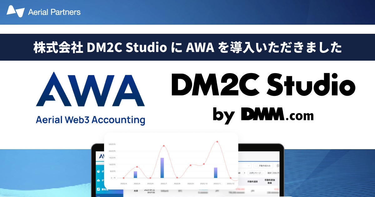 2024年4月1日、デジタルアセットの会計・税務・データ管理サービスを提供する株式会社Aerial Partners(本社:東京都港区、代表取締役:沼澤健人、以下:当社)は、運営するWeb3事業者向け経理サポートツール「AWA(Aerial Web3 Accounting)」が、株式会社DM2C Studioに導入されましたことをお知らせします。