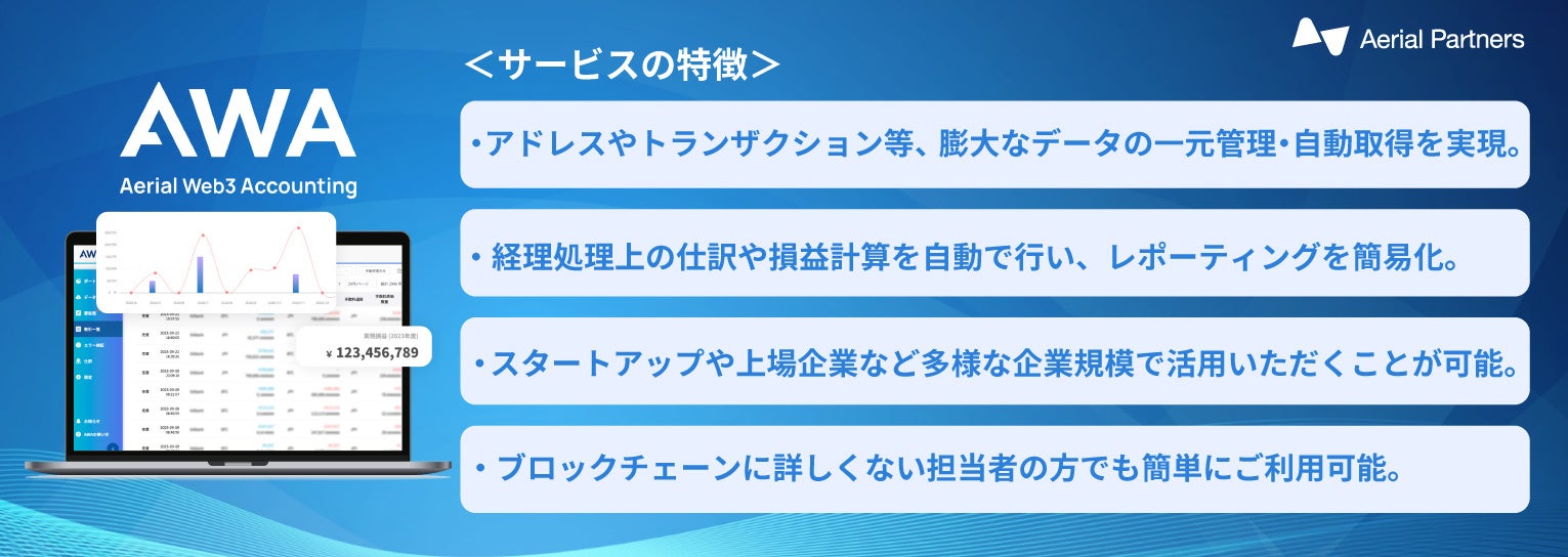・AWA(Aerial Web3 Accounting):ブロックチェーン知識不要で利用できる、Web3事業者向けの経理サポートツール。管理の手間を削減し、事業をドライブさせる体制づくりを支援します。