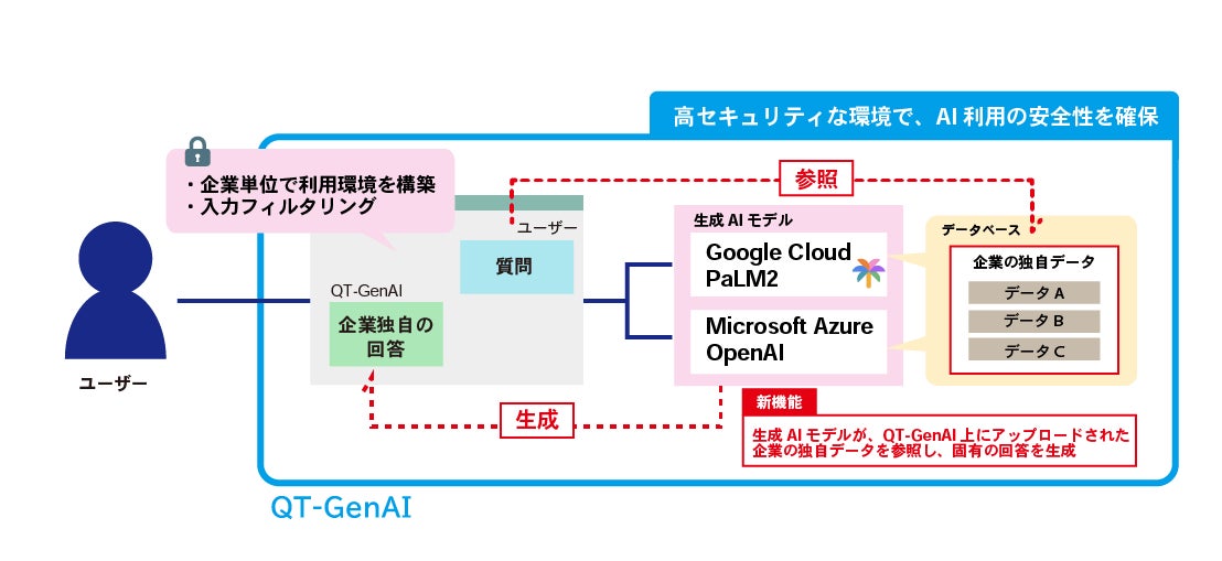 QT-GenAIは、企業単位での利用環境の構築、入力フィルタリング機能などを有し、機密性の高い環境下で安全に生成AIが利用できるサービスです。今回追加された機能は、QT-GenAI上にアップロードした企業の独自データを生成AIモデルが参照し、企業固有の回答を生成できるもので、更なる生産性向上が期待できます。