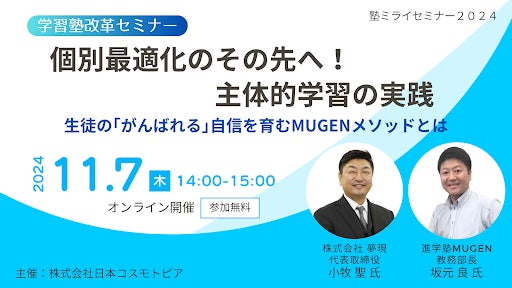 「自立学習」「生涯学習」を事業の軸とし、学習塾・学校・生涯学習教室向けICT教材システムの企画・制作・販売を手がける株式会社日本コスモトピア(本社:大阪府大阪市、代表取締役社長:尾上 幸裕、以下:日本コスモトピア)は、学習塾業界の課題にいち早く取り組んできた鹿児島県の学習塾MUGENからゲストを招き、学習塾を対象とした学習塾向け塾ミライセミナー2024 第2弾「学習塾MUGENに学ぶ個別最適化のその先へ!主体的学習の実践 〜生徒の「がんばれる」自信を育むMUGENメソッドとは 〜」を、2024年11月7日(木)14:00〜15:00にてオンライン開催します。
