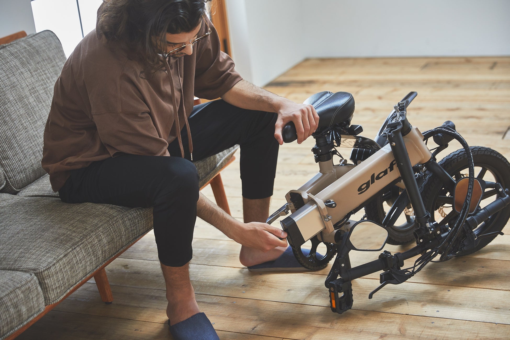 約19kgと軽量設計だから、原付スクーターに比べると重さは約1/3、そのため女性でも取り回しが楽にできる。コンパクトに折りたためるのでアパートの玄関に保管できるなど置き場所にも困らない。