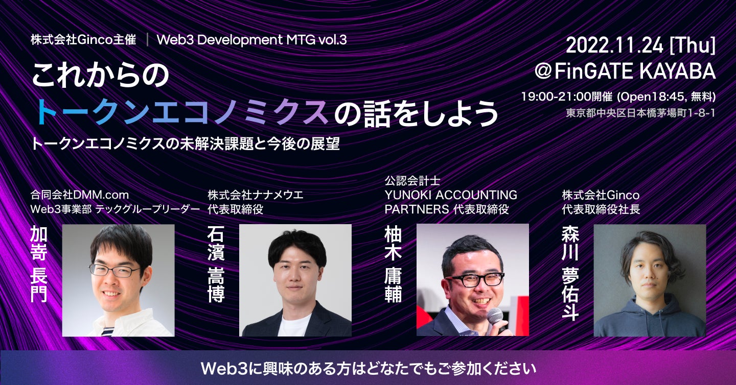「これからのトークンエコノミクスの話をしよう〜トークンエコノミクスの未解決課題と展望〜」と題し、DMM.com合同会社 Web3事業部 テックグループリーダーの加嵜 長門氏、株式会社ナナメウエ 代表取締役の石濵 嵩博氏、公認会計士でYUNOKI ACCOUNTING PARTNERS 代表取締役の柚木 庸輔氏を迎え開催します。