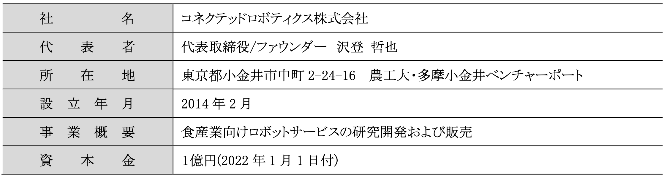 コネクテッドロボティクスは 「食産業をロボティクスで革新する」をミッションに、「高度なロボット制御の技術」と「ディープラーニングを活用したセンシングと学習技術」を組み合わせたテクノロジーを強みに、たこやきロボット、ソフトクリームロボット、そばロボット、フライドポテトロボット、検品ロボット、盛付ロボット「Delibot」等、食材を扱うロボットシステムを開発。実際の店舗や工場での多数の導入実績を持っています。
