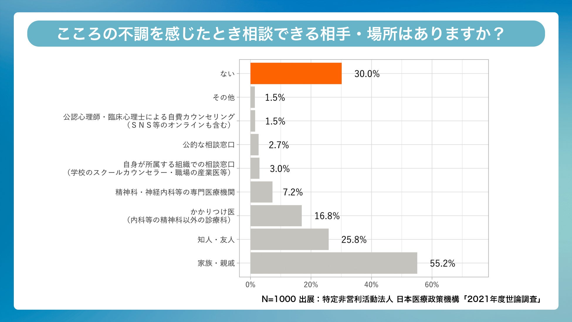 2021年に日本医療政策機構が行った調査では「こころの不調を感じた時の相談先」について「家族・親戚」を除き、「ない」と答えた人が最も多いことがわかっています。こころの不調が重度な精神疾患を招かないよう、早期の段階での医療的指導が求められていますが、日本では偏見や思い込みの国民性から、地域の医療機関への自発的な受診につながりづらく、相談からかかりつけ医に接続するところまでを支援する環境整備が必要です。