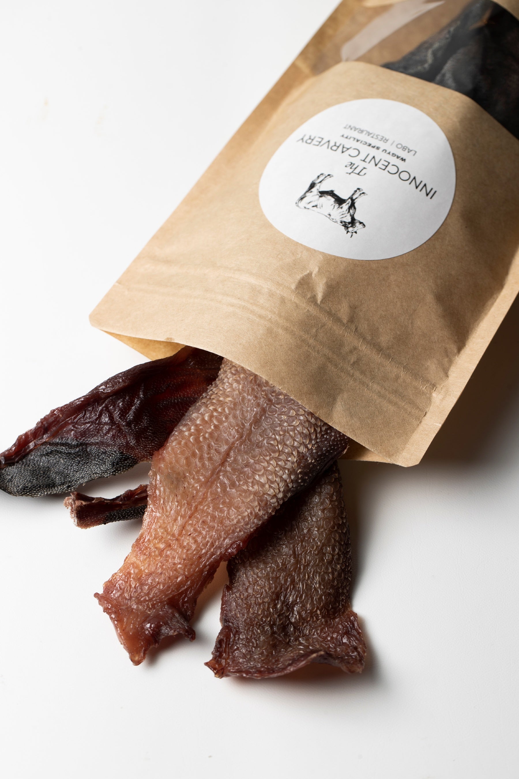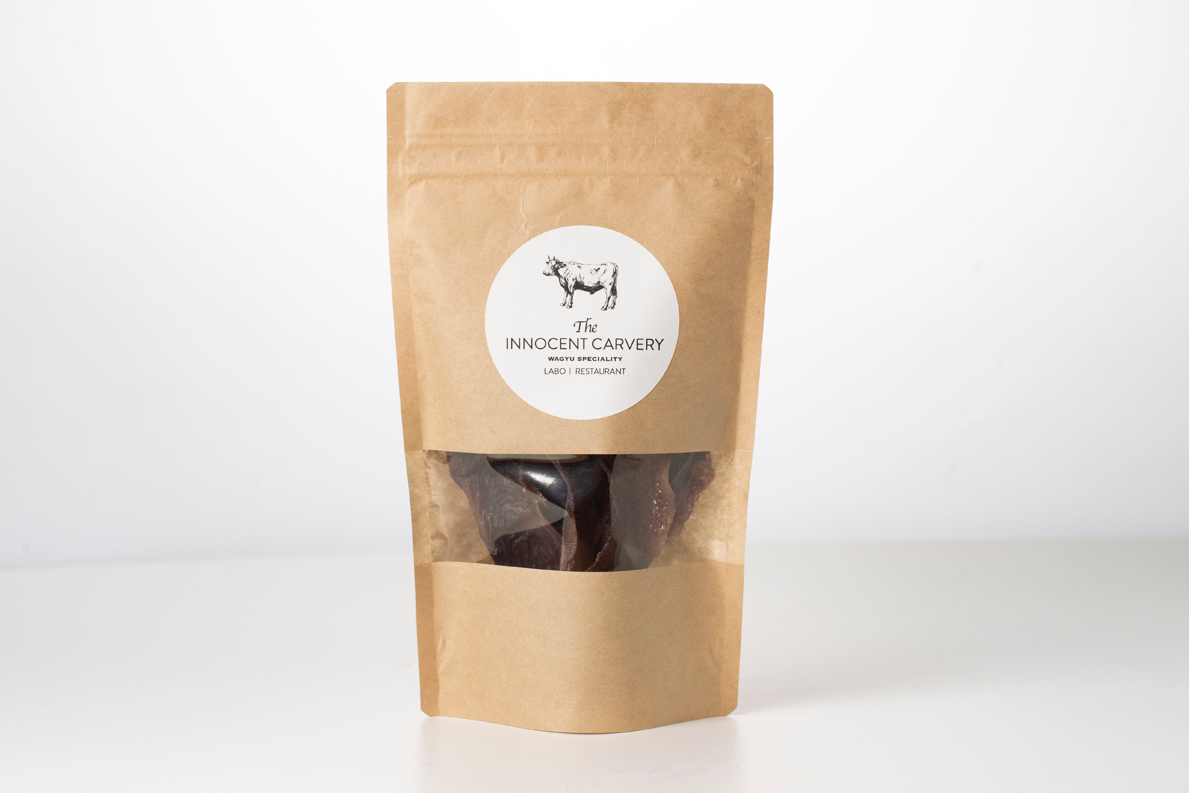 「国産黒毛和牛タン皮ジャーキー」は、お店で提供される希少な黒毛和牛のタンの皮をドライエイジング加工し旨味を凝縮、手作り・無添加にこだわったジャーキです。原材料には、和牛のスペシャリストが選定し、お店でも提供される希少な国産黒毛和牛のタンの外皮を使用しています。人間の食用としては固さが残る部位を丁寧に加工しジャーキーにしました。これまで破棄されていたタンの外皮を使うことで、年間約240~360kgの生ごみの減少にも繋がり環境にも配慮した製品です。
