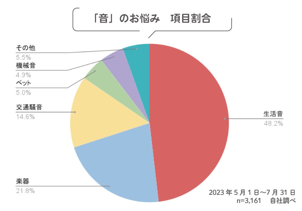 ピアリビングでは、年間13,000件を超えるご相談が寄せられます。直近のデータ(2023/5/1〜7/31、3,161件)によると、全体のご相談のうち48.2%が「生活音」によるお悩みが占めました。