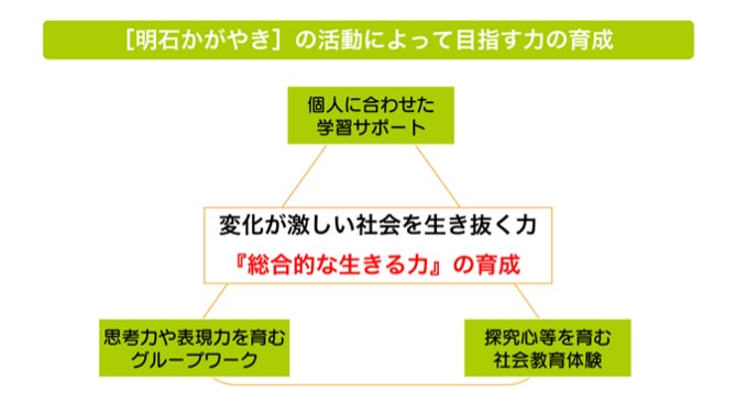 [明石かがやき]では、個々に合わせた学習支援に加えて、参加者全員で話し合いながら考えるグループワークや施設見学や宿泊を伴う体験活動を実施しています。これらの活動を通して、変化が激しい社会を生き抜く力『総合的な生きる力』を育成します。