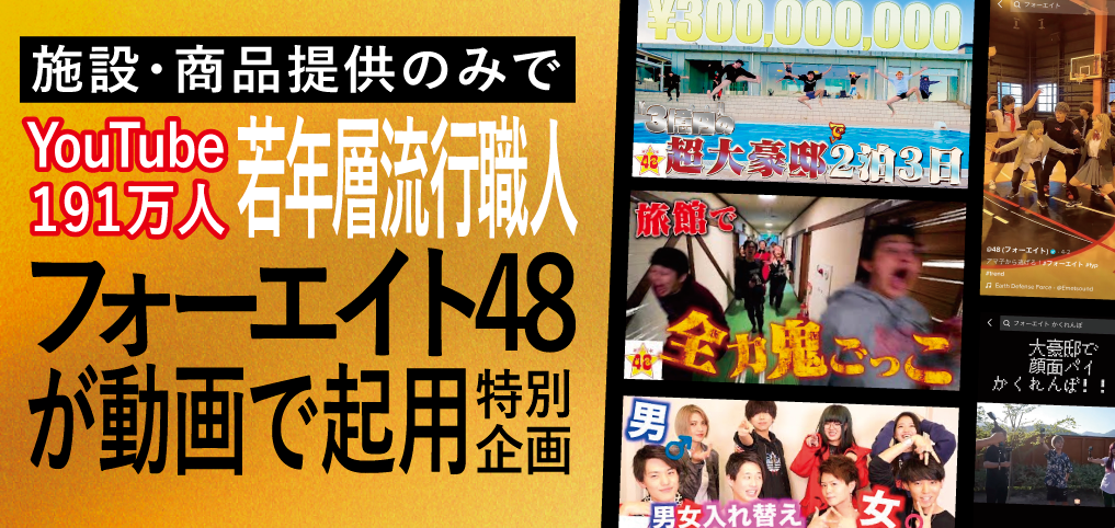 チャンネル登録者数190万人超の人気YouTuber“フォーエイト48”が動画で商品や施設を紹介してくれる!インフルエンサーPR実績15万件の『toridori marketing』が特別プランを発表