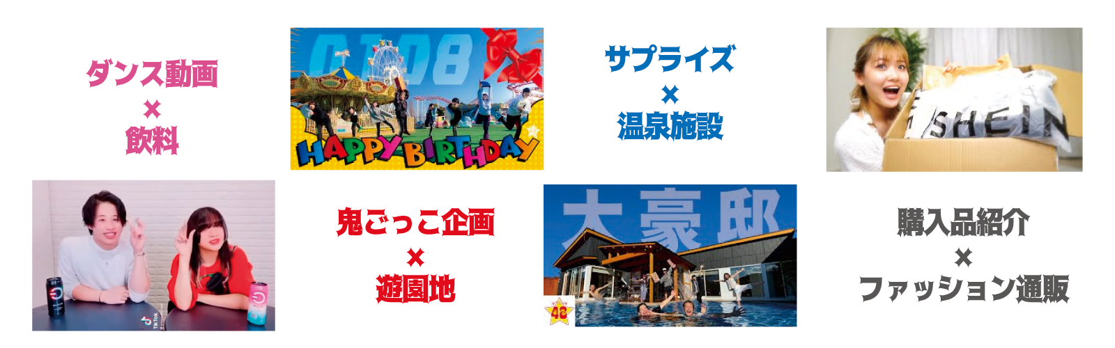 “フォーエイト48”は、平均TikTokフォロワー数150万人を超える人気TikToker7名が結成した男女混合YouTubeグループです。メンバー1人ひとりにファンがついており、対決企画、歌やダンス、ドッキリ、バラエティ、コント等多彩なジャンルの動画を発信できるため、商品・施設の特徴に適した動画プロモーションが可能です。