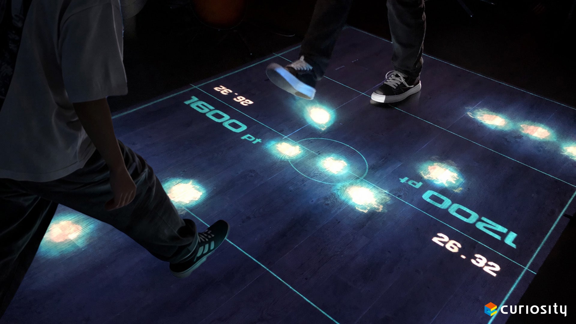 光のボールを蹴ってゴールを狙うデジタルスポーツ体験。シンプルなルールで年齢を問わず楽しめる。