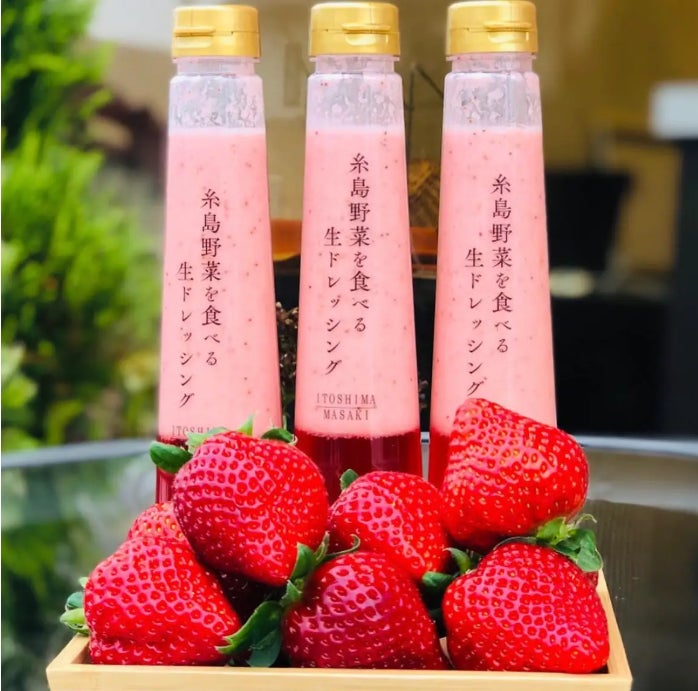 新鮮な糸島野菜をそのまま擦り下ろした生ドレッシング。季節ごとに移ろう野菜や果実をお楽しみいただけます。例年大人気の期間限定商品「糸島野菜を食べる生ドレッシング(あまおう)」も販売します。